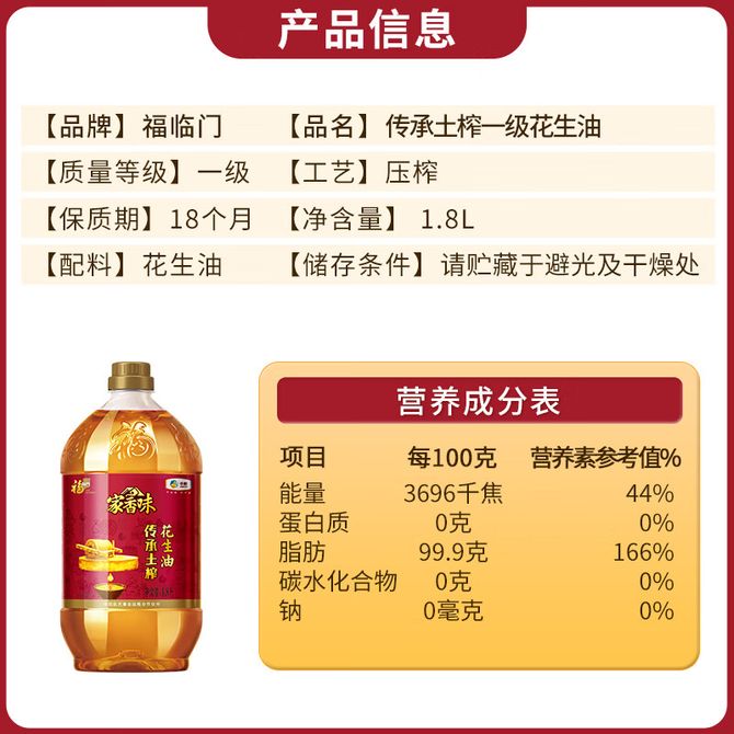 福临门 家香味传承土榨花生油1.8L土法压榨食用油花生油 家香味传承土榨花生油1.8L 兑换价格 3000 里程 会员卡别 终身白金卡 白金卡 金卡 银卡 普通卡 儿童卡 服务 由 广西桂人礼互联网科技有限公司 发货并提供售后 油品规格: 1.8L 购买数量: 件 库存件 配送地址: 立即购买 加入购物车 成功添加到购物车 关闭 购物车共有 种商品 总金额为: 组合销售 产品介绍 产品规格 售后服务 产品咨询 发现好货 珍佰粮菜籽油5L 5500 里程 长寿花 金胚玉米油食用油非转基因压榨一级 1.8L 2200 里程 福临门 一级大豆油900ML/瓶 优质家用食用油 1100 里程 福临门 家香味食用油 沂蒙土榨 花生仁油900ml 1300 里程 长寿花金胚玉米油1.8L 2400 里程