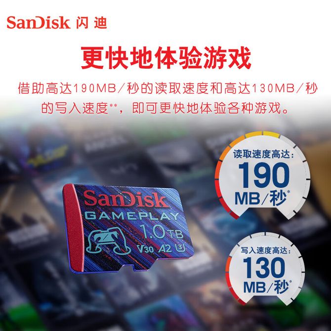 闪迪/SanDisk 1TB TF存储卡 A2 U3 V30 4K游戏内存卡 快速读写游戏机专用卡 专用于移动端和掌机游戏,A2性能程序加载更快,读速高达190MB/S,写速高达130MB/S,更少延迟,高清录制畅拍4K视频,快速加载,多重防护,持久耐用,终身质保。 兑换价格 28500 里程 会员卡别 终身白金卡 白金卡 金卡 银卡 普通卡 儿童卡 服务 由 智科精品 发货并提供售后 存储容量: 1TB 购买数量: 件 库存件 配送地址: 立即购买 加入购物车 成功添加到购物车 关闭 购物车共有 种商品 总金额为: 组合销售 产品介绍 产品规格 售后服务 产品咨询 发现好货 雷克沙/Lexar TF(MicroSD)存储卡 C10 U3 V30 A1 高速内存卡633x-32G/64G/128G/256G/512G 1400-13300 里程 ThinkPlus 存储卡V30 4K超高清拍摄 监控存储卡 TF卡Micro SD卡 32G/64G/128G/256G 1300-7400 里程 360 视频监控 摄像头 专用Micro SD存储卡TF卡 32GB Class10 1900 里程 360 视频监控 摄像头 专用Micro SD存储卡TF卡 64GB Class10 3500 里程 雷克沙/Lexar TF(MicroSD) 高速存储卡U3 V30 A2无人机手机内存卡1066x 读速160MB/s 4K超清 3300-46500 里程