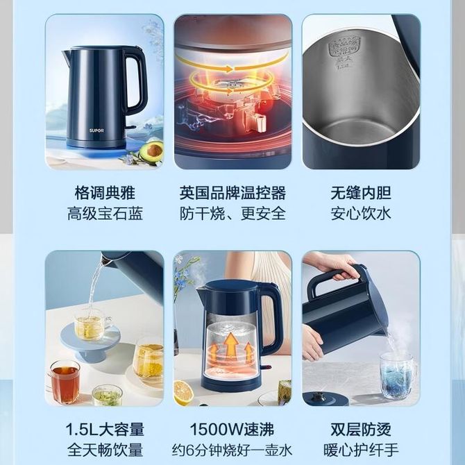 苏泊尔/Supor 电水壶 1.5L烧水壶304不锈钢家用电水壶开水壶 SW-15T101C 1.5L容量;外塑内钢;双层保温;304不锈钢内胆; 兑换价格 4400 里程 会员卡别 终身白金卡 白金卡 金卡 银卡 普通卡 儿童卡 服务 由 小枫叶专营店 发货并提供售后 颜色: 蓝色 购买数量: 件 库存件 配送地址: 立即购买 加入购物车 成功添加到购物车 关闭 购物车共有 种商品 总金额为: