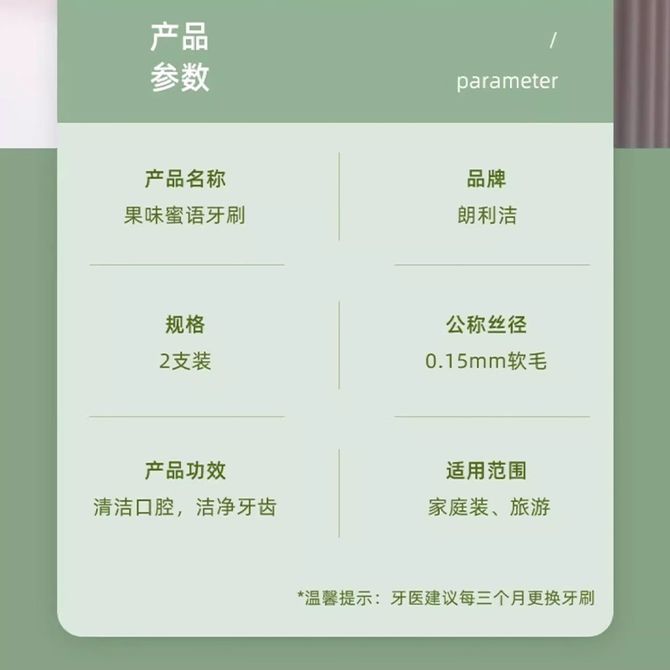 朗利洁 果味蜜语牙刷 2支装*4卡 (共到手8支) 软毛牙刷 小头清洁牙齿 纤细刷毛简约刷柄 家庭装 果味蜜语牙刷 2支装*4卡 (共到手8支) 兑换价格 1100 里程 会员卡别 终身白金卡 白金卡 金卡 银卡 普通卡 儿童卡 服务 由 广西北部湾网络科技有限公司 发货并提供售后 牙刷牙线规格: 组合装 购买数量: 件 库存件 配送地址: 立即购买 加入购物车 成功添加到购物车 关闭 购物车共有 种商品 总金额为: 组合销售 产品介绍 产品规格 售后服务 产品咨询 发现好货 舒客舒克竹炭洁齿牙线棒50支*2盒成人坚韧扁线牙签方便携随身盒 1100 里程 高露洁(Colgate) 宽柔绵绵丝牙刷轻适刷双支装 1100 里程 狮王 (Lion )细齿洁抗菌儿童牙刷 细毛软毛 颜色随机发 2000 里程 舒客 洁齿牙线棒家庭旅行装12袋/共240支 便携分装 细扁线专效洁齿 高拉力深层清洁牙缝 1500 里程 冷酸灵 软毛成人牙刷 细毛护龈深洁齿缝 国货老牌 云感觉牙刷 10支 1400 里程