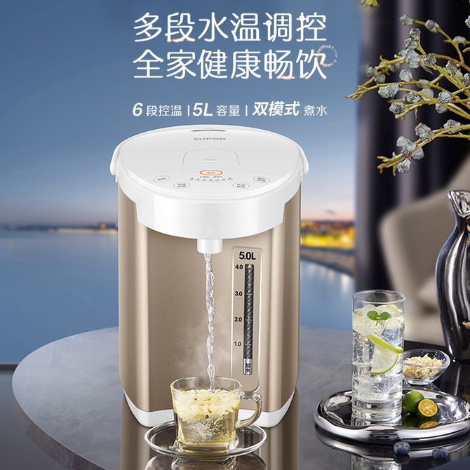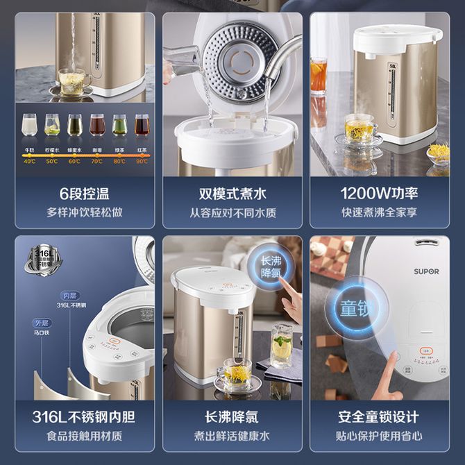 苏泊尔(SUPOR) 316L不锈钢内胆电热水瓶5L容量 家用6段控温双模式煮水开水壶安全童锁设计 316L不锈钢内胆 长沸降氯 安全童锁设计 6段控温 双模式煮水 1200W功率 5L容量 兑换价格 13000 里程 会员卡别 终身白金卡 白金卡 金卡 银卡 普通卡 儿童卡 服务 由 广西桂福礼供应链管理有限公司 发货并提供售后 颜色: 其他 购买数量: 件 库存件 配送地址: 立即购买 加入购物车 成功添加到购物车 关闭 购物车共有 种商品 总金额为: 组合销售 产品介绍 产品规格 售后服务 产品咨询 发现好货 苏泊尔(SUPOR)电水壶 1.7L 不锈钢/YL SW-17S13A 5700 里程 志高/Chigo 电水壶烧水壶1.8L大容量电热水壶双层防烫自动断电家用烧水开水壶不锈钢 电水壶 DC-A18F 1900 里程 小熊/Bear 电水壶家用烧水壶 不锈钢自动断电恒温热水壶保温一体电热水壶1.5L容量 3500 里程 小熊/Bear 烧水壶电水壶热水壶电热水壶开水壶304不锈钢内胆双层防烫1.5L大容量ZDH-Q15U8 3000 里程 志高(CHIGO) 电水壶1.8L大容量烧水壶家用热水壶开水壶DC-A18F 1900 里程