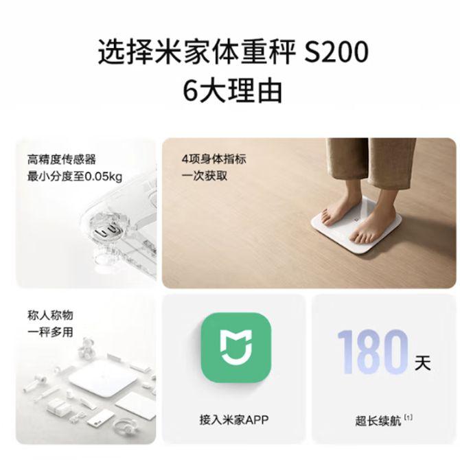 米家 智能体重秤S200 白色 双接家用健康秤电子秤 人物双模式 APP数据测量 智能分析 体重管理白色 一秤多用,精准称重 兑换价格 3700 里程 会员卡别 终身白金卡 白金卡 金卡 银卡 普通卡 儿童卡 服务 由 九樱互动家电专营店 发货并提供售后 颜色: 白色 购买数量: 件 库存件 配送地址: 立即购买 加入购物车 成功添加到购物车 关闭 购物车共有 种商品 总金额为: