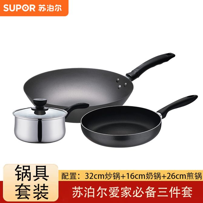 苏泊尔(SUPOR) 爱家必备三件套 32cm炒锅+16cm奶锅+26cm煎锅家用厨房烹饪锅具套装