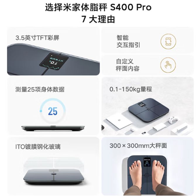 米家 智能体脂秤S400 Pro 深灰色 TFT彩屏交互双接电子秤体重管理 高精准25项身体数据平衡测试 塑形减脂 多项身体指标,大屏直接看 兑换价格 10600 里程 会员卡别 终身白金卡 白金卡 金卡 银卡 普通卡 儿童卡 服务 由 九樱互动家电专营店 发货并提供售后 颜色: 其他 购买数量: 件 库存件 配送地址: 立即购买 加入购物车 成功添加到购物车 关闭 购物车共有 种商品 总金额为: