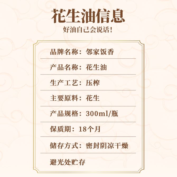 邻家饭香 压榨一级花生油300ml/瓶新鲜花生压榨浓郁花生香色泽清凉味道香醇 甄选原料颗粒饱满香味浓郁 兑换价格 1100 里程 会员卡别 终身白金卡 白金卡 金卡 银卡 普通卡 儿童卡 服务 由 壮乡优品生活馆 发货并提供售后 油品规格: 300ml 购买数量: 件 库存件 配送地址: 立即购买 加入购物车 成功添加到购物车 关闭 购物车共有 种商品 总金额为: 组合销售 产品介绍 产品规格 售后服务 产品咨询 发现好货 珍佰粮菜籽油5L 5500 里程 长寿花 金胚玉米油食用油非转基因压榨一级 1.8L 2200 里程 福临门 一级大豆油900ML/瓶 优质家用食用油 1100 里程 福临门 家香味食用油 沂蒙土榨 花生仁油900ml 1300 里程 长寿花金胚玉米油1.8L 2400 里程
