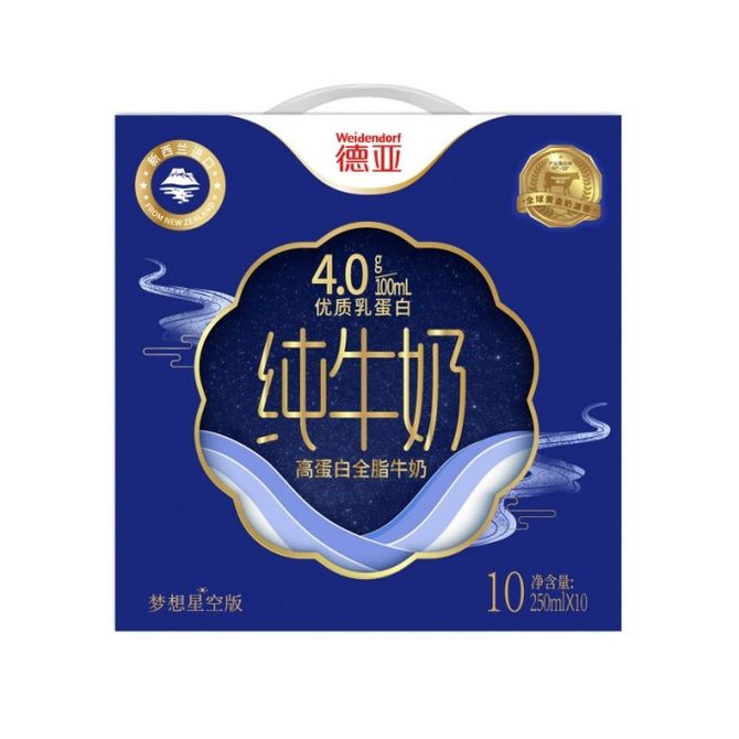 德亚 4.0g 新西兰进口高蛋白全脂纯牛奶 天然牧场 原生高钙 250ml*10礼盒(梦想星空版) 兑换价格 3000 里程 会员卡别 终身白金卡 白金卡 金卡 银卡 普通卡 儿童卡 服务 由 隆兴日盛食品优选店 发货并提供售后 规格: 礼盒 购买数量: 件 库存件 配送地址: 立即购买 加入购物车 成功添加到购物车 关闭 购物车共有 种商品 总金额为: 组合销售 产品介绍 产品规格 售后服务 产品咨询 发现好货 蒙牛 特仑苏纯牛奶苗条装250ml×12盒 2900 里程 三元 经典小方白全脂纯牛奶250ml*24盒牛奶 整箱 3400 里程 伊利金典纯牛奶250ml*12盒整箱 2200 里程 三元 极致 全脂纯牛奶250ml*12盒 优质乳蛋白 恪守天然亲和 2900 里程 伊利 金典纯牛奶整箱 250ml*12盒 原生高钙3.6g乳蛋白 2000 里程