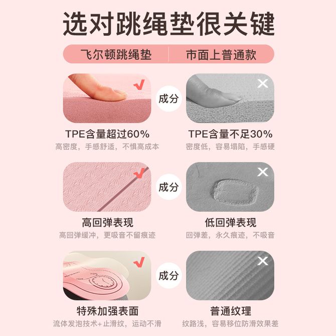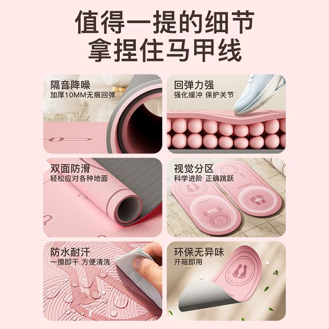 飞尔顿/fed 室内跳绳垫瑜伽垫减震垫 6mm热辣粉 跳绳垫 热辣粉 1400x625x6mm 兑换价格 1400 里程 会员卡别 终身白金卡 白金卡 金卡 银卡 普通卡 儿童卡 服务 由 盛为运动户外专营店 发货并提供售后 颜色: 粉色 购买数量: 件 库存件 配送地址: 立即购买 加入购物车 成功添加到购物车 关闭 购物车共有 种商品 总金额为: 组合销售 产品介绍 产品规格 售后服务 产品咨询 发现好货 赛丹孚 瑜伽垫女生专用防滑运动健身垫加宽加厚加长tpe家用静音地垫纯垫子-体位线 185*80*0.6cm 4700 里程 KEEP 按摩筋膜球 瑜伽健身肌肉放松足底手腕腰部肩颈康复训练手抓球 粉色 1200 里程 yottoy 按摩头枕 2600 里程 KEEP 力量训练阻力带 拉力绳弹力带运动伸展练肩家用辅助带 绿色 25磅 1900 里程 得力(deli) 安格耐特系列NBR瑜伽垫 FL200(三色可选) 1800 里程