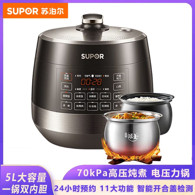 苏泊尔(SUPOR) 家用电压力煲 电高压锅 电压力锅5L容量一锅双内胆70kPa高压炖煮智预约快速煲汤智能开合盖检测 70kPa高压炖煮 电压力锅 5L大容量 一锅双内胆 24小时预约 11大功能 智能开合盖检测 兑换价格 20000 里程 会员卡别 终身白金卡 白金卡 金卡 银卡 普通卡 儿童卡 服务 由 广西自贸区京通桂达科技发展有限公司 发货并提供售后 颜色: 其他 购买数量: 件 库存件 配送地址: 立即购买 加入购物车 成功添加到购物车 关闭 购物车共有 种商品 总金额为: 组合销售 产品介绍 产品规格 售后服务 产品咨询 发现好货 苏泊尔(SUPOR)电压力锅 6升大容量 智能触控 球釜双胆 开盖收汁 一键排压 SY-60YC8001Q 高压锅 16900 里程 苏泊尔(SUPOR) 5L电压力锅家用电高压锅双胆高压电饭锅煮饭智能预约 SY-50YC8186 11300 里程 美的/Midea 电压力锅 高压锅家用电压力煲智能预约电饭煲大容量多功能定时预约电饭煲3-8人单胆旋钮款4L MY-E4809 8700 里程 美的/Midea 电压力锅4.8L智能预约高压锅一锅两胆不串味一键排气安全快速多功能大屏数显电压力锅 13900 里程 美的/Midea 电压力锅 5L 一锅双胆 多功能家用易清洁双胆高压快煮上蒸下煮 高压锅 YL50X5-201 12700 里程