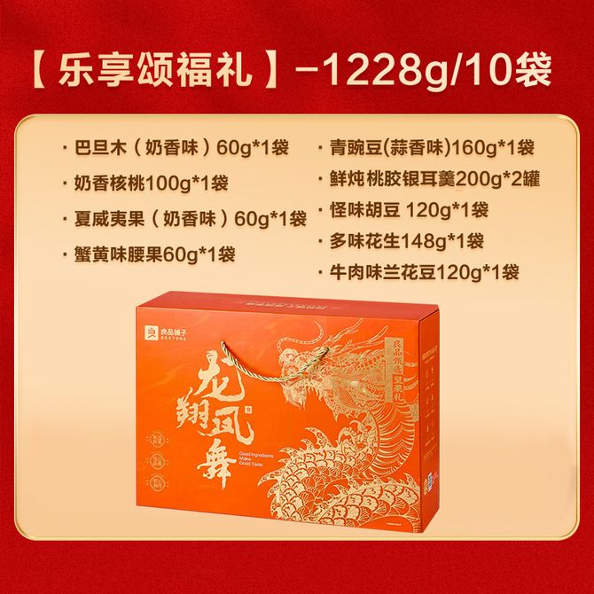 良品铺子 坚果礼盒 颂福礼1228g 巴旦木(奶香味)60g 奶香核桃 100g 夏威夷果(奶香味)60g 蟹黄味腰果 60g 青豌豆(蒜香味) 160g 怪味胡豆 120g 多味花生 148g 牛肉味兰花豆 120g 鲜炖桃胶银耳羹200g*2 兑换价格 3300 里程 会员卡别 终身白金卡 白金卡 金卡 银卡 普通卡 儿童卡 服务 由 多宝商城 发货并提供售后 规格: 礼盒 购买数量: 件 库存件 配送地址: 立即购买 加入购物车 成功添加到购物车 关闭 购物车共有 种商品 总金额为: 组合销售 产品介绍 产品规格 售后服务 产品咨询 发现好货 西域美农 新疆薄皮核桃500g/袋 新疆特产原味 薄皮核桃 1300 里程 西域美农 烘焙腰果200g 坚果特产 休闲零食 带皮腰果仁 1600 里程 味滋源 紫皮腰果2袋装 每袋100g 1100 里程 百草味 坚果炒货夏威夷果100g*1袋 1100 里程 鲜记/xianjee 每日坚果原香酥脆388g/罐 1800 里程