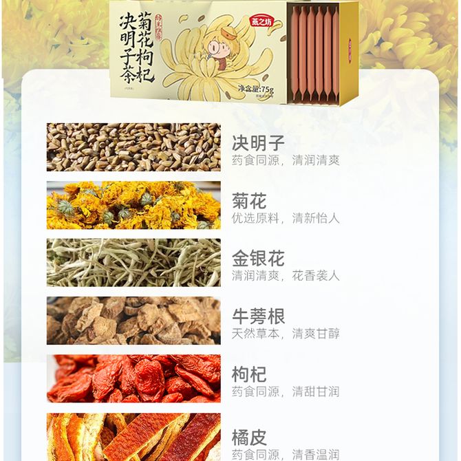 燕之坊 菊花枸杞决明子茶(代用茶)75g清热消暑利水茶包金黄透亮菊香清新独立茶包即冲即饮 茶包遇水后,花果香逐渐释放,汤色金黄,菊香清新,口感清爽 兑换价格 1300 里程 会员卡别 终身白金卡 白金卡 金卡 银卡 普通卡 儿童卡 服务 由 壮乡优品生活馆 发货并提供售后 规格: 盒装 购买数量: 件 库存件 配送地址: 立即购买 加入购物车 成功添加到购物车 关闭 购物车共有 种商品 总金额为: