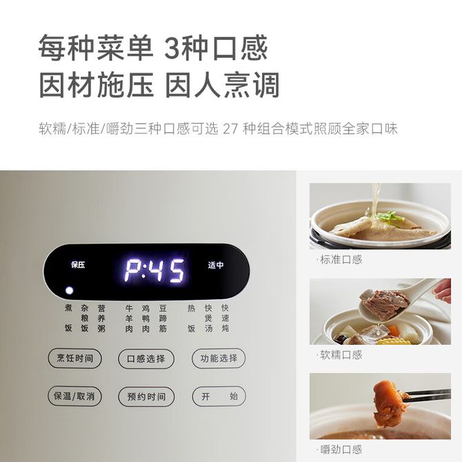 组合销售 产品介绍 产品规格 售后服务 产品咨询 发现好货 苏泊尔(SUPOR)电压力锅 6升大容量 智能触控 球釜双胆 开盖收汁 一键排压 SY-60YC8001Q 高压锅 16900 里程 苏泊尔(SUPOR) 5L电压力锅家用电高压锅双胆高压电饭锅煮饭智能预约 SY-50YC8186 11300 里程 美的/Midea 电压力锅 高压锅家用电压力煲智能预约电饭煲大容量多功能定时预约电饭煲3-8人单胆旋钮款4L MY-E4809 8700 里程 美的/Midea 电压力锅 5L 一锅双胆 多功能家用易清洁双胆高压快煮上蒸下煮 高压锅 YL50X5-201 12700 里程 美的/Midea 电压力锅 上蒸下煮家用智能双胆电高压锅电饭锅多功能高压电饭煲电蒸锅5升 MY-YL50M3 10900 里程