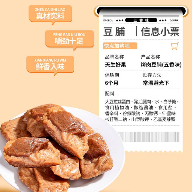 天生好果/TIAN SHENG HAO GUO 贪吃象烤肉豆脯195g严选食材香醇味美嚼劲十足 真材实料,嚼劲十足,鲜香入味 兑换价格 1100 里程 会员卡别 终身白金卡 白金卡 金卡 银卡 普通卡 儿童卡 服务 由 壮乡优品生活馆 发货并提供售后 规格: 袋装 购买数量: 件 库存件 配送地址: 立即购买 加入购物车 成功添加到购物车 关闭 购物车共有 种商品 总金额为: 组合销售 产品介绍 产品规格 售后服务 产品咨询 发现好货 稻香村 桃酥640g 老式宫廷饼干 点心传统糕点 1600 里程 鲜记 每日坚果7日装140g 混合坚果果干坚果炒货孕妇营养健康休闲零食坚果礼盒 1300 里程 稻香村 蜂蜜蛋糕330g/袋*2 糕点 小吃 早餐食品 稻香村蜂蜜蛋糕 早餐面包蛋糕 1300 里程 沃隆每日坚果B款750g礼盒(25克*30) 6100 里程 百草味 手撕面包1kg*1箱 休闲零食 1300 里程