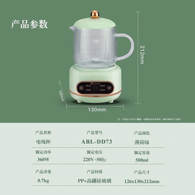 艾贝丽/Abereve 养生壶 薄荷绿 500ml 电炖杯ABL-DD73 电炖杯ABL-DD73 兑换价格 5600 里程 会员卡别 终身白金卡 白金卡 金卡 银卡 普通卡 儿童卡 服务 由 恒百生活馆 发货并提供售后 颜色: 其他 购买数量: 件 库存件 配送地址: 立即购买 加入购物车 成功添加到购物车 关闭 购物车共有 种商品 总金额为: 组合销售 产品介绍 产品规格 售后服务 产品咨询 发现好货 九阳/Joyoung 养生壶1.5L茶具电茶壶煮茶壶花茶壶玻璃煮茶器煎药壶中药锅药膳电水壶烧水壶 3900 里程 九阳/Joyoung 养生壶迷你玻璃花茶壶煮茶器 12大功能11档温度 电水壶热水壶烧水壶 1.5L DGD1506BQ 3900 里程 美的/Midea 养生壶 1.5L家用多功能小型全自动办公室烧水壶加厚玻璃煮茶热水壶 MK-YS15P201 4200 里程 美的/Midea 养生壶 1.5L家用养生壶全自动玻璃烧水壶24h预约烧水壶12小时防干烧保护智能恒温 MK-YS15P202 3700 里程 美的/Midea 养生壶 1.5L全自动电热水壶 24h预约12小时智能恒温 14大功能11档控温 花茶壶煮茶器MK-Y12Q 3500 里程