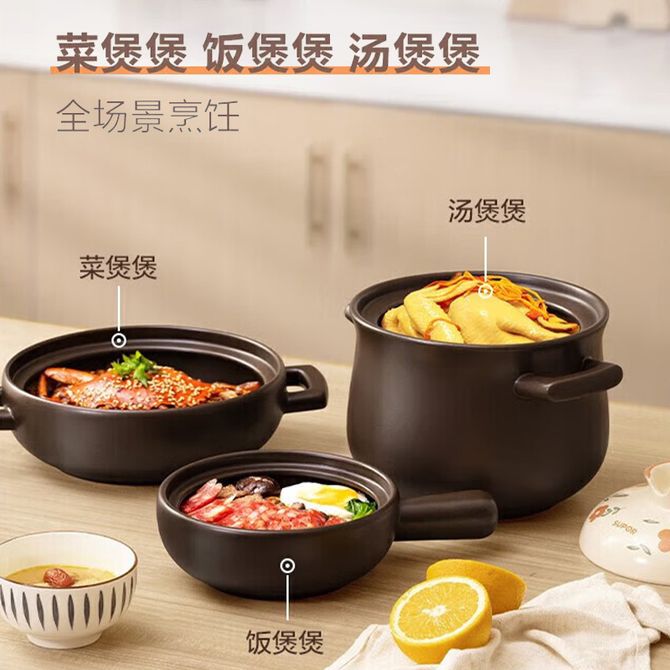 组合销售 产品介绍 产品规格 售后服务 产品咨询 发现好货 荣事达/Royalstar 煲锅 砂锅煲汤熬药煮粥焖饭砂锅陶瓷炖汤沙锅家用养生汤锅瓦煲瓦罐4.6L 3900 里程 爱仕达(ASD) 煲锅 砂锅煲汤炖锅2.5L陶瓷煲仔饭砂锅燃气灶明火专用 4800 里程 炊大皇/Cookerking 砂锅5L耐高温陶瓷煲多用炖锅汤锅家用养生煲陶瓷锅明火煤燃气灶专用TCXW5002 4400 里程 炊大皇/Cookerking 砂锅 6L耐高温陶瓷煲多用炖锅汤锅 家用养生煲陶瓷锅 明火煤燃气灶专用TCXW6003 5300 里程 苏泊尔(SUPOR) 砂锅煲汤锅炖锅4.5L养生煲耐高温不开裂陶瓷煲EB45MAT01 6000 里程