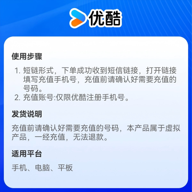优酷 YOUKU优酷土豆黄金vip会员月卡/1个月,不支持电视端,短链形式 /打开收到的短信链接填写充值手机号/兑换码