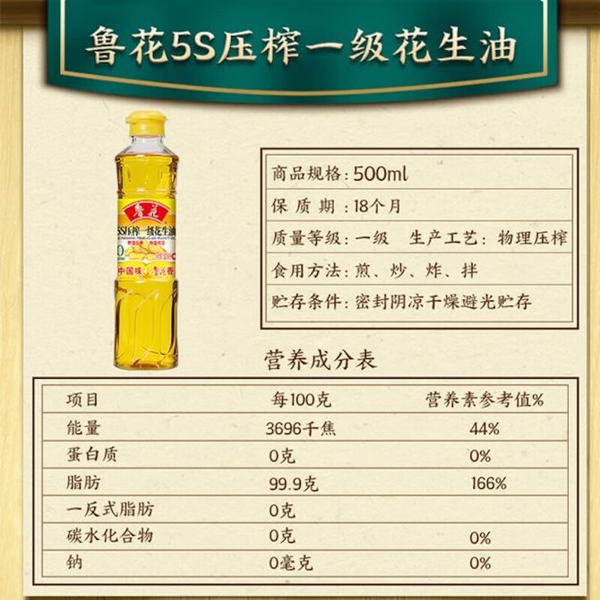 鲁花 5S物理压榨一级花生油500ml 食用油小包装家庭用更方便新老包装随机发货 兑换价格 1100 里程 会员卡别 终身白金卡 白金卡 金卡 银卡 普通卡 儿童卡 服务 由 恒诚佳品店铺 发货并提供售后 油品规格: 500ml 购买数量: 件 库存件 配送地址: 立即购买 加入购物车 成功添加到购物车 关闭 购物车共有 种商品 总金额为: 组合销售 产品介绍 产品规格 售后服务 产品咨询 发现好货 珍佰粮菜籽油5L 5500 里程 长寿花 金胚玉米油食用油非转基因压榨一级 1.8L 2200 里程 福临门 一级大豆油900ML/瓶 优质家用食用油 1100 里程 福临门 家香味食用油 沂蒙土榨 花生仁油900ml 1300 里程 长寿花金胚玉米油1.8L 2400 里程