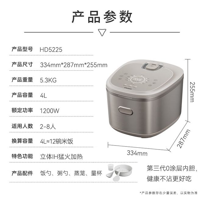 飞利浦/Philips 电饭煲HD5225 家用0涂层IH4L升级鲜润面膜饭 水膜盾0涂层不粘锅 电饭煲4-5人 0涂层IH4L家用升级鲜润面膜饭 水膜盾0涂层不粘锅 电饭煲4-5人 兑换价格 33000 里程 会员卡别 终身白金卡 白金卡 金卡 银卡 普通卡 儿童卡 服务 由 纳华优选 发货并提供售后 颜色: 银色 购买数量: 件 库存件 配送地址: 立即购买 加入购物车 成功添加到购物车 关闭 购物车共有 种商品 总金额为: