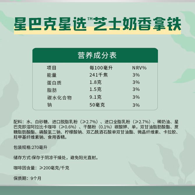 星巴克 芝士奶香拿铁 270ml*15瓶 瓶装咖啡饮料低脂肪 芝士奶香拿铁 270ml*15瓶 兑换价格 5600 里程 会员卡别 终身白金卡 白金卡 金卡 银卡 普通卡 儿童卡 服务 由 同力阳光食品专营店 发货并提供售后 规格: 瓶装 购买数量: 件 库存件 配送地址: 立即购买 加入购物车 成功添加到购物车 关闭 购物车共有 种商品 总金额为: 组合销售 产品介绍 产品规格 售后服务 产品咨询 发现好货 隅田川冻干速溶纯黑咖啡粉100g 巴西进口 2200 里程 星巴克 星选芝士奶香270ml*3瓶 即饮咖啡瓶装饮料 1200 里程 味滋源 小颗粒苦咖啡豆粉速溶咖啡美式黑咖啡20g*5盒(共50袋) 1100 里程 星巴克Nespresso浓遇胶囊咖啡10粒中度烘焙特选综合美式大杯瑞士进口 2200 里程 摩可纳/MOCCONA 经典深度烘焙冻干速溶咖啡 100g 3900 里程