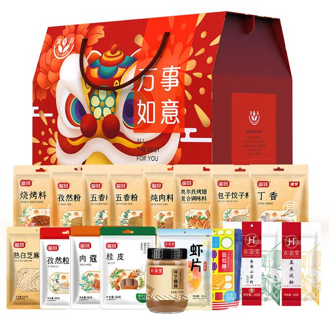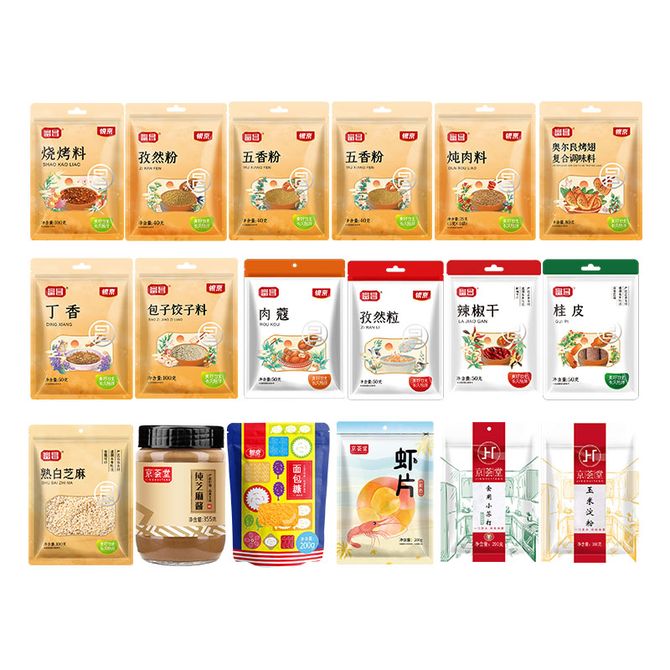 熟白芝麻粒100g 奥尔良烤翅复合调味料80g 桂皮50g 丁香50g 肉蔻50g 五香粉40g 炖肉料25g 孜然粉40g 孜然粒50g 辣椒干50g 烧烤料100g 花椒粉30g 黄面包糠200g 虾片200g 小苏打200g 纯芝麻酱355g 玉米淀粉300g 包子饺子料100g