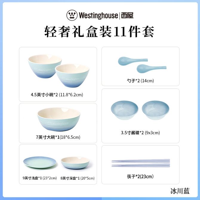 西屋/Westinghouse 家用小碗大碗深盘浅盘酱碟勺子筷子 轻奢系列11件套 配置:4.5英寸小碗*2、7英寸大碗*1、8英寸深盘*1、9英寸浅盘*1、3.5寸酱碟*2、勺子*2、筷子*2 兑换价格 12600 里程 会员卡别 终身白金卡 白金卡 金卡 银卡 普通卡 儿童卡 服务 由 众生缘(江苏)互联网科技有限公司 发货并提供售后 颜色: 其他 购买数量: 件 库存件 配送地址: 立即购买 加入购物车 成功添加到购物车 关闭 购物车共有 种商品 总金额为: