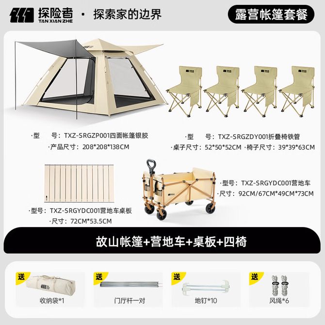 探险者(TAN XIAN ZHE) 露营装备全套 帐篷+营地车+桌板+四椅 帐篷:210D涂银牛津布,车:加厚碳钢层 +600D牛津布料,板:碳钢,椅:加厚钢管+600D牛津布 兑换价格 40500 里程 会员卡别 终身白金卡 白金卡 金卡 银卡 普通卡 儿童卡 服务 由 威嘉宏户外馆 发货并提供售后 颜色: 黄色 购买数量: 件 库存件 配送地址: 立即购买 加入购物车 成功添加到购物车 关闭 购物车共有 种商品 总金额为:
