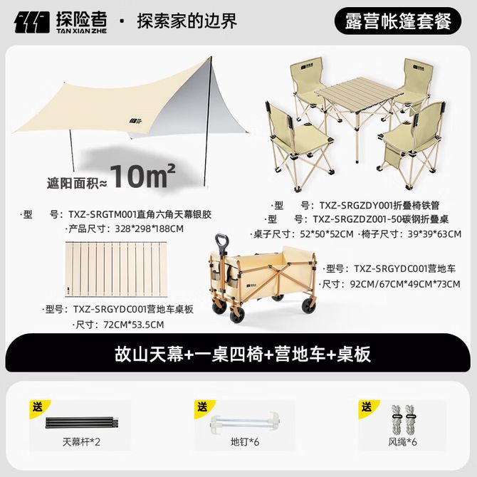 探险者(TAN XIAN ZHE) 户外桌椅天幕露营推车带桌板组合 天幕:600D涂银牛津布,桌:碳钢,椅:加厚钢管+600D牛津布,车:加厚碳钢层 +600D牛津布料,板:碳钢 兑换价格 41400 里程 会员卡别 终身白金卡 白金卡 金卡 银卡 普通卡 儿童卡 服务 由 威嘉宏户外馆 发货并提供售后 颜色: 黄色 购买数量: 件 库存件 配送地址: 立即购买 加入购物车 成功添加到购物车 关闭 购物车共有 种商品 总金额为: