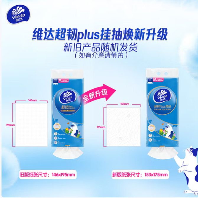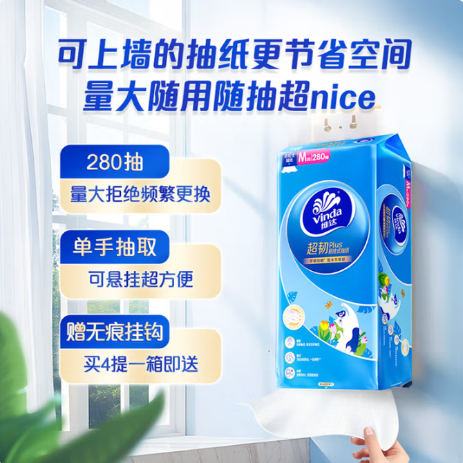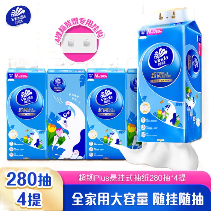 维达 超韧Plus挂抽3层280抽*4提M码 悬挂式软萌猫咪款纸巾 整箱 280抽*4提M码,新旧随机发货 兑换价格 1800 里程 会员卡别 终身白金卡 白金卡 金卡 银卡 普通卡 儿童卡 服务 由 念家生活馆 发货并提供售后 包装数量: 4提 购买数量: 件 库存件 配送地址: 立即购买 加入购物车 成功添加到购物车 关闭 购物车共有 种商品 总金额为: 组合销售 产品介绍 产品规格 售后服务 产品咨询 发现好货 维达卷纸 卫生纸实惠装厕纸家用厕所纸巾手纸整箱批有芯大卷家庭装 1200-2300 里程 维达 Vinda 卷纸 140g/卷*10卷 蓝色经典3层卫生纸 1300 里程 心相印抽纸 茶语丝享系列 量贩家庭装 3层*100抽*4包(茶香 压花) 1100 里程 心相印 经典系列 二层面巾纸 180抽*6包*1提 1100 里程 维达Vinda 超韧系列抽纸(3层*130抽*6包) 原生木浆卫生餐巾纸婴儿面巾纸 6包优惠装 1100 里程
