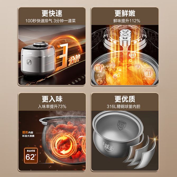 组合销售 产品介绍 产品规格 售后服务 产品咨询 发现好货 苏泊尔(SUPOR)电压力锅 6升大容量 智能触控 球釜双胆 开盖收汁 一键排压 SY-60YC8001Q 高压锅 16900 里程 苏泊尔(SUPOR) 5L电压力锅家用电高压锅双胆高压电饭锅煮饭智能预约 SY-50YC8186 11300 里程 美的/Midea 电压力锅 【一锅双胆】5L全自动家用智能预约 上蒸下煮 不粘双胆煲汤炖肉 YL50Q3-451 10900 里程 美的/Midea 电压力锅 【双胆】5升大容量电饭煲全自动智能饭锅多功能高压锅 24小时智能预约 MY-E523 10400 里程 九阳/Joyoung 电压力锅5L家用电饭锅压力煲电高压锅煮饭锅电饭锅电饭煲全自动智能预约 Y-50C31 11000 里程