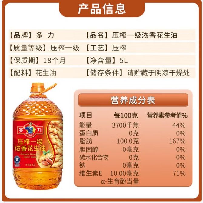 多力 浓香花生油5L 精选红衣花生 多项食安全认证 规格;5L*1桶;新旧包装随机发货 兑换价格 6900 里程 会员卡别 终身白金卡 白金卡 金卡 银卡 普通卡 儿童卡 服务 由 一间食品馆 发货并提供售后 油品规格: 5L 购买数量: 件 库存件 配送地址: 立即购买 加入购物车 成功添加到购物车 关闭 购物车共有 种商品 总金额为: 组合销售 产品介绍 产品规格 售后服务 产品咨询 发现好货 珍佰粮菜籽油5L 5500 里程 长寿花 金胚玉米油食用油非转基因压榨一级 1.8L 2200 里程 福临门 一级大豆油900ML/瓶 优质家用食用油 1100 里程 福临门 家香味食用油 沂蒙土榨 花生仁油900ml 1300 里程 长寿花金胚玉米油1.8L 2400 里程