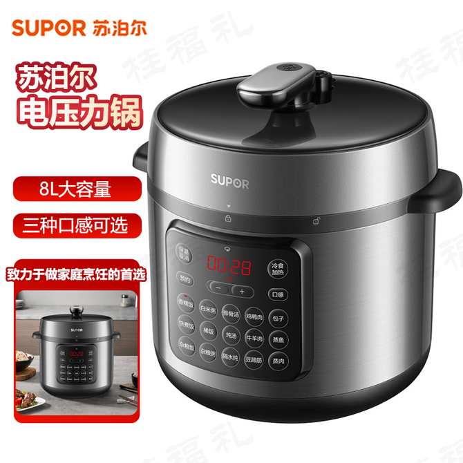 苏泊尔(SUPOR) 电压力锅 8L 蒸煮多用锅家用双层蒸屉电高压锅大面板显示24小时预约一键排压 8L大容量,双层蒸屉,大面板操控,三种口感可选,24小时预约 兑换价格 26100 里程 会员卡别 终身白金卡 白金卡 金卡 银卡 普通卡 儿童卡 服务 由 广西桂福礼供应链管理有限公司 发货并提供售后 颜色: 其他 购买数量: 件 库存件 配送地址: 立即购买 加入购物车 成功添加到购物车 关闭 购物车共有 种商品 总金额为: