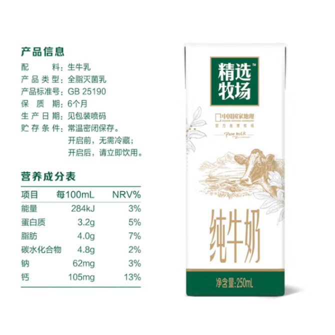 组合销售 产品介绍 产品规格 售后服务 产品咨询 发现好货 蒙牛 特仑苏纯牛奶苗条装250ml×12盒 2900 里程 三元 经典小方白全脂纯牛奶250ml*24盒牛奶 整箱 3400 里程 伊利金典纯牛奶250ml*12盒整箱 2200 里程 三元 极致 全脂纯牛奶250ml*12盒 优质乳蛋白 恪守天然亲和 2900 里程 伊利 金典纯牛奶整箱 250ml*12盒 原生高钙3.6g乳蛋白 2000 里程