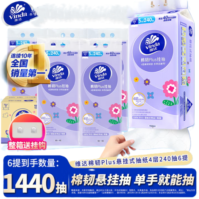 维达 棉韧悬挂式抽纸6提家用壁挂卫生纸巾加厚餐巾纸面巾纸实惠装厕纸 棉韧亲肤 4层 240抽*6提 整箱装 240抽*6提,新旧随机发货 兑换价格 3100 里程 会员卡别 终身白金卡 白金卡 金卡 银卡 普通卡 儿童卡 服务 由 臻雀个护馆 发货并提供售后 包装数量: 箱 购买数量: 件 库存件 配送地址: 立即购买 加入购物车 成功添加到购物车 关闭 购物车共有 种商品 总金额为: 组合销售 产品介绍 产品规格 售后服务 产品咨询 发现好货 维达卷纸 卫生纸实惠装厕纸家用厕所纸巾手纸整箱批有芯大卷家庭装 1200-2300 里程 维达 Vinda 卷纸 140g/卷*10卷 蓝色经典3层卫生纸 1300 里程 心相印抽纸 茶语丝享系列 量贩家庭装 3层*100抽*4包(茶香 压花) 1100 里程 心相印 经典系列 二层面巾纸 180抽*6包*1提 1100 里程 维达Vinda 超韧系列抽纸(3层*130抽*6包) 原生木浆卫生餐巾纸婴儿面巾纸 6包优惠装 1100 里程