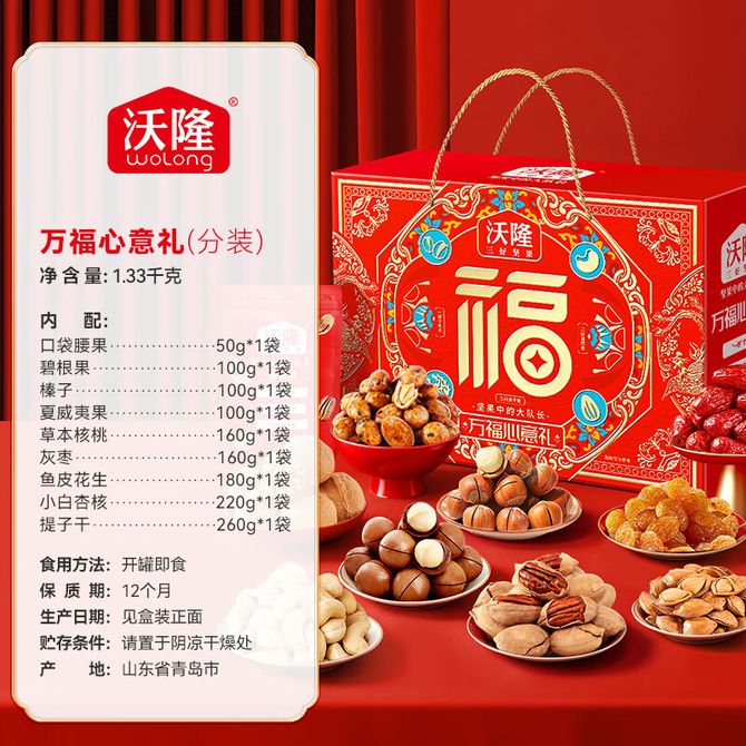 沃隆(wolong) 万福心意礼1.33kg 坚果炒货休闲食品零食大礼包 沃隆(wolong) 万福心意礼1.33kg 坚果炒货休闲食品零食大礼包 兑换价格 3900 里程 会员卡别 终身白金卡 白金卡 金卡 银卡 普通卡 儿童卡 服务 由 繁星尚品 发货并提供售后 规格: 组合 购买数量: 件 库存件 配送地址: 立即购买 加入购物车 成功添加到购物车 关闭 购物车共有 种商品 总金额为: 组合销售 产品介绍 产品规格 售后服务 产品咨询 发现好货 西域美农 新疆薄皮核桃500g/袋 新疆特产原味 薄皮核桃 1300 里程 西域美农 烘焙腰果200g 坚果特产 休闲零食 带皮腰果仁 1600 里程 味滋源 紫皮腰果2袋装 每袋100g 1100 里程 百草味 坚果炒货夏威夷果100g*1袋 1100 里程 沃隆每日坚果(A)175g盒装 1700 里程