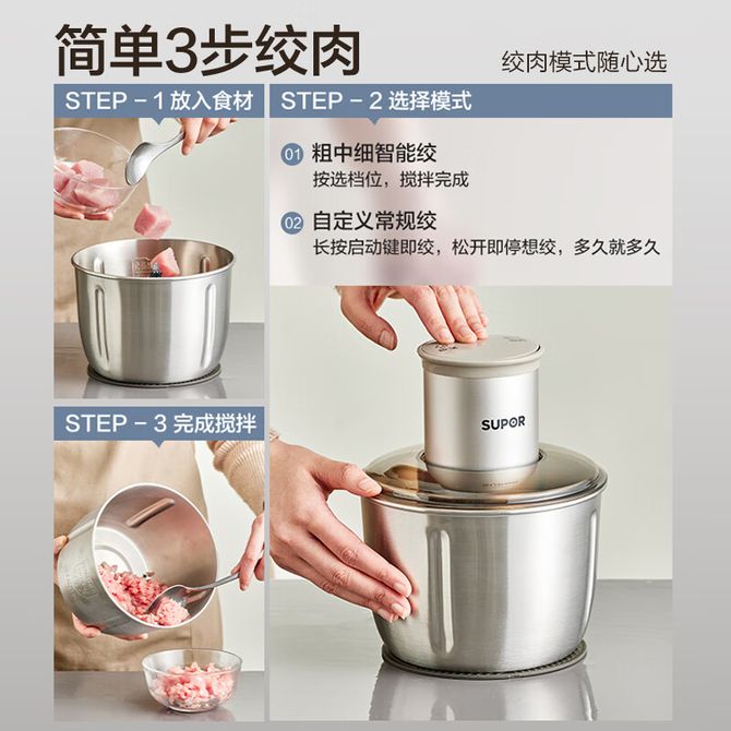 苏泊尔(SUPOR) 绞肉机JR-E02SG220 家用电动多功能家用搅拌机婴儿辅食机 大容量不锈钢碎肉机搅拌机 家用电动多功能家用搅拌机婴儿辅食机 大容量不锈钢碎肉机搅拌机 兑换价格 10400 里程 会员卡别 终身白金卡 白金卡 金卡 银卡 普通卡 儿童卡 服务 由 纳华优选 发货并提供售后 颜色: 银色 购买数量: 件 库存件 配送地址: 立即购买 加入购物车 成功添加到购物车 关闭 购物车共有 种商品 总金额为: 组合销售 产品介绍 产品规格 售后服务 产品咨询 发现好货 卡屋KAWU 绞肉机2.3L家用电动碎肉机PY-37930一副刀片 3300 里程 小熊/Bear 绞肉机家用绞馅机碎肉机电动多功能料理搅拌打肉饺子肉馅蒜蓉机切碎机QSJ-D03W5 4000 里程 小熊/Bear 绞肉机家用QSJ-E03K6 绞馅机 碎肉机 电动多功能料理蒜蓉机 3400 里程 苏泊尔(SUPOR) 绞肉机家用多功能电动碎肉机料理机 辅食肉馅机 蔬菜机 大容量 1.75L JR20-B175 3000 里程 卡屋kawu 蒜蓉器多功能电动无线蒜泥机 1700 里程