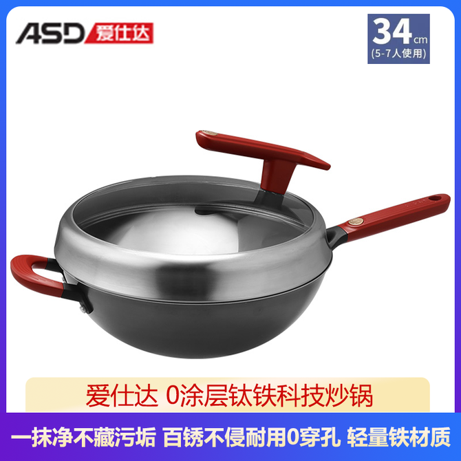 爱仕达/ASD 0涂层钛铁科技炒锅34cm百锈不侵耐用0穿孔轻量铁材质易掂锅