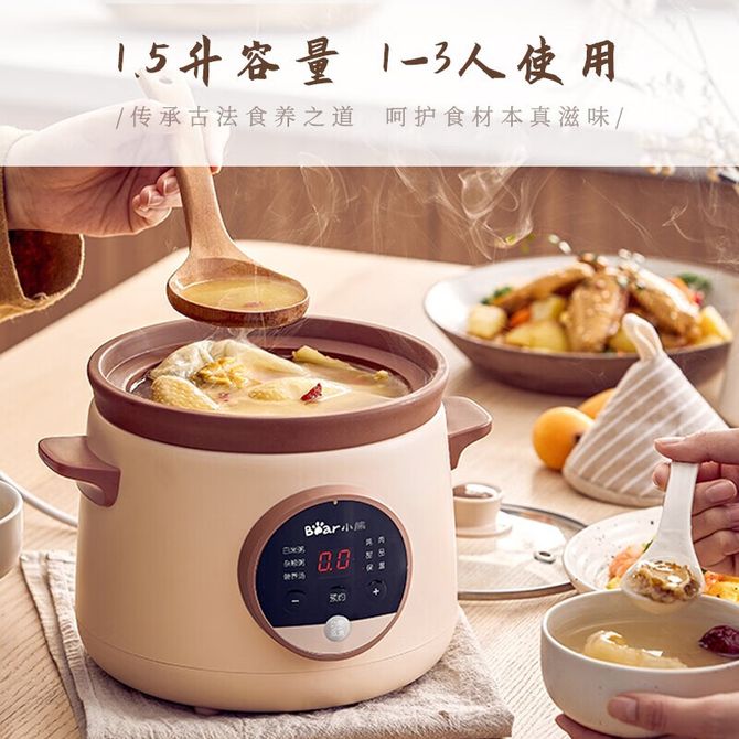 小熊/Bear 电炖锅 1.5L可预约定时保温天然原矿紫砂锅 煲汤炖汤熬粥煮粥锅 天然原矿紫砂 免看管 不溢锅 预约定时 自动保温 兑换价格 6000 里程 会员卡别 终身白金卡 白金卡 金卡 银卡 普通卡 儿童卡 服务 由 观脂电器 发货并提供售后 颜色: 其他 购买数量: 件 库存件 配送地址: 立即购买 加入购物车 成功添加到购物车 关闭 购物车共有 种商品 总金额为: 组合销售 产品介绍 产品规格 售后服务 产品咨询 发现好货 小熊/Bear 电炖锅1-2人小炖锅煮粥锅智能预约定时煲汤锅炖汤锅燕窝炖盅 4400 里程 西屋/Westinghouse 多功能电煮锅电炖锅1.6L一锅多能WFB16A 11600 里程 小熊(Bear)电炖锅电炖盅煮粥神器煲汤锅炖汤锅婴儿煮粥锅熬粥燕窝炖盅DDG-E15K2 4800 里程 利仁(Liven)电炒锅电煮锅电火锅 家用多功能小电锅电炖锅宿舍泡面锅 4.5L容量 DHG-X451 5200 里程 九阳(Joyoung)多功能电热锅 小煮锅电蒸锅 1-2人1.5L泡面电火锅 HG10-G71S 5000 里程