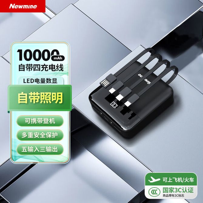 纽曼(Newmine) 3C认证自带线10000毫安时充电宝 小方块电量显示手机移动电源 可上飞机高铁 【带LED照明灯】 3C认证可上飞机高铁 兑换价格 10400 里程 会员卡别 终身白金卡 白金卡 金卡 银卡 普通卡 儿童卡 服务 由 单象数码专营店 发货并提供售后 电池容量: 8001mAh-10000mAh 颜色: 亚光黑 购买数量: 件 库存件 配送地址: 立即购买 加入购物车 成功添加到购物车 关闭 购物车共有 种商品 总金额为: 组合销售 产品介绍 产品规格 售后服务 产品咨询 发现好货 ZNNCO 充电宝20000毫安时超薄小巧迷你自带线大容量快充移动电源便携苹果华为小米2万mAh手机 4200 里程 睿量/Remax 磁吸无线充电宝 Magsafe快充 5000mAh超薄小巧便携移动电源 手机背夹迷你移动电源 适用于苹果华为小米手机 RPP-107 4600 里程 ZNNCO 充电宝20000毫安时移动电源超薄小巧自带线迷你快充大容量便携苹果华为小米2万mAh手机 3000 里程 纽曼 AL35大容量10000毫安时 22.5W超级快充充电宝 超薄小巧便携迷你 3700 里程 纽曼(Newmine) 自带四线充电宝 3C认证 LED智能数显10000毫安移动电源 AL03 经典黑 3000 里程