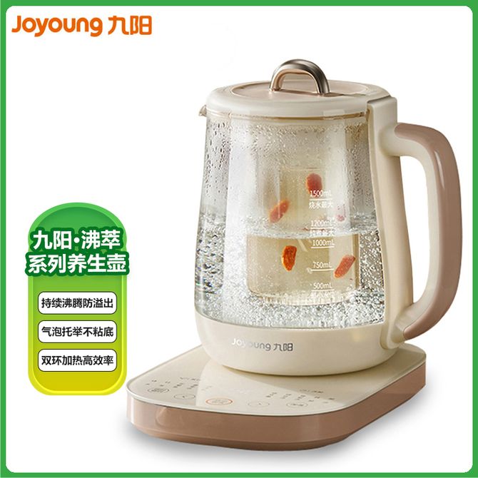九阳/Joyoung 沸萃系列养生壶 1.5L容量 高硼硅玻璃茶篮轻音降噪多功能养生烧水壶 1.5L大容量,1200W大功率, 24h预约+保温,180S提壶记忆 兑换价格 12200 里程 会员卡别 终身白金卡 白金卡 金卡 银卡 普通卡 儿童卡 服务 由 中农创家电生活馆 发货并提供售后 颜色: 其他 购买数量: 件 库存件 配送地址: 立即购买 加入购物车 成功添加到购物车 关闭 购物车共有 种商品 总金额为: 组合销售 产品介绍 产品规格 售后服务 产品咨询 发现好货 九阳/Joyoung 养生壶1.5L茶具电茶壶煮茶壶花茶壶玻璃煮茶器煎药壶中药锅药膳电水壶烧水壶 3900 里程 美的/Midea 养生壶 1.5L家用多功能小型全自动办公室烧水壶加厚玻璃煮茶热水壶 MK-YS15P201 4200 里程 美的/Midea 养生壶 1.5L家用养生壶全自动玻璃烧水壶24h预约烧水壶12小时防干烧保护智能恒温 MK-YS15P202 3500 里程 九阳/Joyoung 养生壶迷你玻璃花茶壶煮茶器 12大功能11档温度 电水壶热水壶烧水壶 1.5L DGD1506BQ 3900 里程 美的/Midea 养生壶 1.5L全自动电热水壶 24h预约12小时智能恒温 14大功能11档控温 花茶壶煮茶器MK-Y12Q 3500 里程