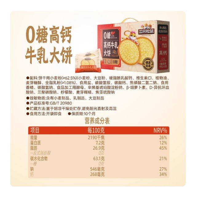 三只松鼠 牛乳大饼礼盒1080g零食品饼干网红好吃办公室0糖高钙 0糖高钙 兑换价格 2300 里程 会员卡别 终身白金卡 白金卡 金卡 银卡 普通卡 儿童卡 服务 由 兴旺食品店 发货并提供售后 规格: 盒装 购买数量: 件 库存件 配送地址: 立即购买 加入购物车 成功添加到购物车 关闭 购物车共有 种商品 总金额为: 组合销售 产品介绍 产品规格 售后服务 产品咨询 发现好货 三只松鼠 全麦面包 1000g 全麦吐司手撕营养早餐代餐零蔗糖零脂粗粮面包 1400 里程 良品铺子 黑麦吐司 1000gx1箱 2200 里程 黄老五 无糖黑芝麻酥 450g袋 小零食四川特产黑芝麻药食同源 2500 里程 三只松鼠 0糖薏米燕麦山药饼干杂粮营养早餐代餐休闲零食品礼盒老人送长辈 【0糖】薏米燕麦山药饼干 1盒装 2300 里程 三只松鼠 无糖 猴头菇饼干礼盒800g粗粮高膳食纤维代餐早餐送礼 2100 里程