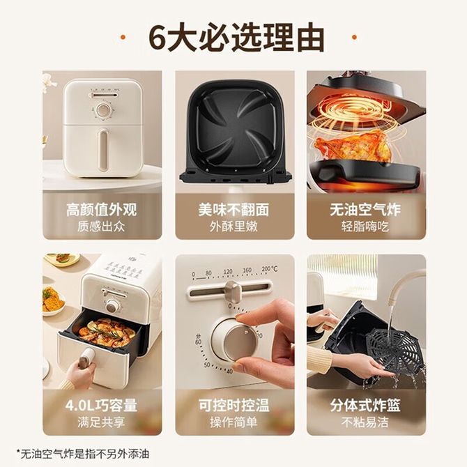 九阳/Joyoung 空气炸锅 4L大容量家用全自动不用翻面分离式炸篮智能电炸锅 4.0L巧容量 可控时控温 分体式炸篮 无油空气炸 兑换价格 8700 里程 会员卡别 终身白金卡 白金卡 金卡 银卡 普通卡 儿童卡 服务 由 聚品惠家电生活馆 发货并提供售后 颜色: 其他 购买数量: 件 库存件 配送地址: 立即购买 加入购物车 成功添加到购物车 关闭 购物车共有 种商品 总金额为: 组合销售 产品介绍 产品规格 售后服务 产品咨询 发现好货 苏泊尔(SUPOR)空气炸锅 家用多功能4.2L大容量 烤箱薯条机 无油烟电炸锅 大功率 无油低脂煎炸锅KJ42D811 6500 里程 苏泊尔(SUPOR)空气炸锅家用3L大容量电炸锅 蒸汽嫩炸多功能无油烟煎炸薯条机烤箱KD30DQ815 21700 里程 美的/Midea 空气炸锅 家用5升可视炸锅金属内腔体微蒸汽多功能智能双旋控温电炸锅 KZE5089 10900 里程 美的/Midea 空气炸锅 可视 不用翻面 金属内腔 蒸汽嫩炸 三档烘烤风力 5L KZC5089 10700 里程 美的/Midea 电火锅 电煮锅 大功率速沸多用途多功能锅一体 旋钮式无极火力调节 6.5L 5200 里程