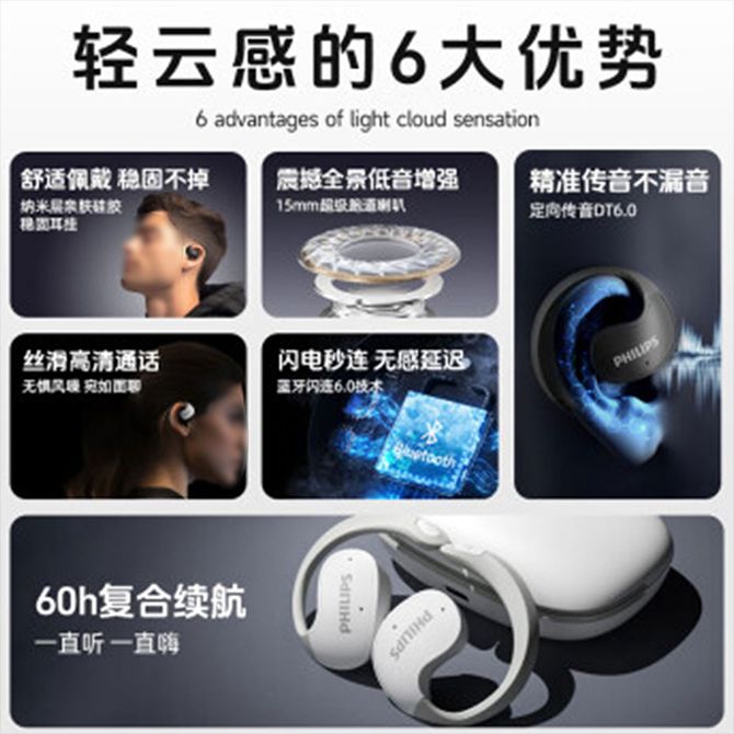 飞利浦/Philips 开放式蓝牙耳机不入耳挂耳式运动跑步长续航高端降噪 开放式不入耳 DEAA集声技术 环绕空间音效 兑换价格 5200 里程 会员卡别 终身白金卡 白金卡 金卡 银卡 普通卡 儿童卡 服务 由 贝洛美智能科技精品馆 发货并提供售后 颜色: 其他 购买数量: 件 库存件 配送地址: 立即购买 加入购物车 成功添加到购物车 关闭 购物车共有 种商品 总金额为: 组合销售 产品介绍 产品规格 售后服务 产品咨询 发现好货 雷摄 运动蓝牙耳机无线跑步超长续航待机半入耳降噪高端健身2024新款 BT-03半入耳 1400 里程 华为/Huawei FreeBuds SE 3 无线蓝牙耳机 流光金 6100 里程 纽曼 LY63蓝牙耳机耳夹式骨传导概念开放式不入耳无线运动音乐通话降噪 3400 里程 纽曼(Newmine) 夹耳式蓝牙耳机 超无感佩戴空气感舒适体验 LY63 3400 里程 飞利浦(PHILIPS) 骨传导通话降噪耳夹式真无线开放耳机TAT3469 7000 里程