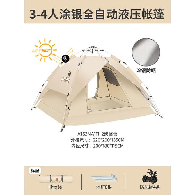 骆驼/Camel 户外帐篷便携式涂银自动速开防晒防雨野营装备 A1S3NA111-2奶酪色 210D牛津布结合细密PU防水涂层,具备荷叶拒水效果;全自动液压式速开帐架 兑换价格 18700 里程 会员卡别 终身白金卡 白金卡 金卡 银卡 普通卡 儿童卡 服务 由 劲芳体育生活馆 发货并提供售后 颜色: 其他 购买数量: 件 库存件 配送地址: 立即购买 加入购物车 成功添加到购物车 关闭 购物车共有 种商品 总金额为: