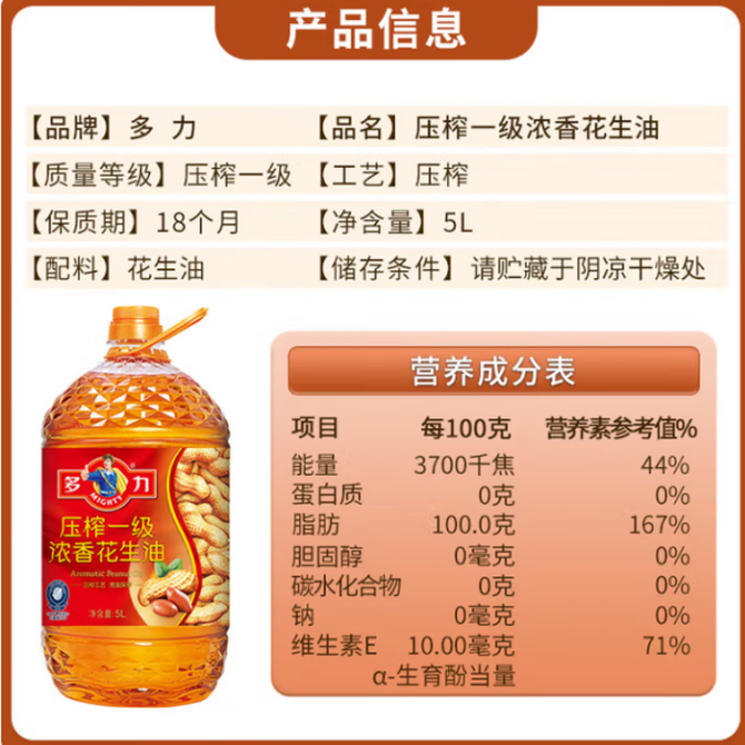 多力 浓香花生油5L 大容量装 压榨工艺 精选红衣花生 一级品质 规格 5L*1桶,新旧包装随机发货 兑换价格 8700 里程 会员卡别 终身白金卡 白金卡 金卡 银卡 普通卡 儿童卡 服务 由 一间食品馆 发货并提供售后 油品规格: 5L 购买数量: 件 库存件 配送地址: 立即购买 加入购物车 成功添加到购物车 关闭 购物车共有 种商品 总金额为: 组合销售 产品介绍 产品规格 售后服务 产品咨询 发现好货 珍佰粮菜籽油5L 5500 里程 长寿花 金胚玉米油食用油非转基因压榨一级 1.8L 2200 里程 福临门 一级大豆油900ML/瓶 优质家用食用油 1100 里程 福临门 家香味食用油 沂蒙土榨 花生仁油900ml 1300 里程 长寿花金胚玉米油1.8L 2400 里程