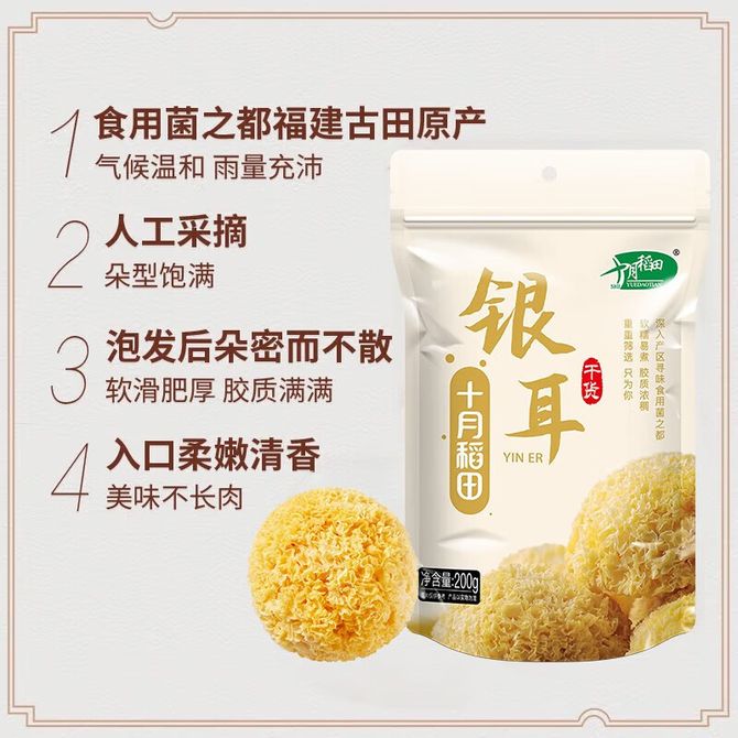十月稻田 银耳200g 保留糯耳原本微黄色泽,拒绝熏硫 又称糯耳,软糯多胶,清香爽口,易煮易泡发,朵型紧致,小朵银耳,色泽微黄,保留糯耳原本微黄色泽,拒绝熏硫 兑换价格 1100 里程 会员卡别 终身白金卡 白金卡 金卡 银卡 普通卡 儿童卡 服务 由 南山精选 发货并提供售后 规格: 袋装 购买数量: 件 库存件 配送地址: 立即购买 加入购物车 成功添加到购物车 关闭 购物车共有 种商品 总金额为: