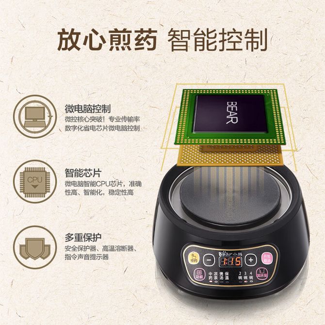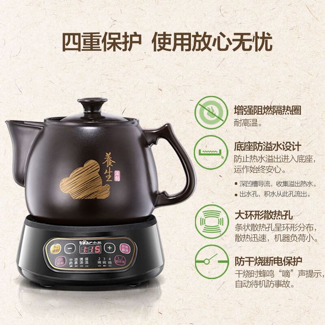 小熊/Bear 煎药壶 家用中药壶熬药电砂锅3升容量分体式陶瓷中药煲 分体式设计,文武火变频 兑换价格 9600 里程 会员卡别 终身白金卡 白金卡 金卡 银卡 普通卡 儿童卡 服务 由 中农创家电生活馆 发货并提供售后 颜色: 其他 购买数量: 件 库存件 配送地址: 立即购买 加入购物车 成功添加到购物车 关闭 购物车共有 种商品 总金额为: 组合销售 产品介绍 产品规格 售后服务 产品咨询 发现好货 九阳/Joyoung 养生壶1.5L茶具电茶壶煮茶壶花茶壶玻璃煮茶器煎药壶中药锅药膳电水壶烧水壶 3900 里程 美的/Midea 养生壶 1.5L家用多功能小型全自动办公室烧水壶加厚玻璃煮茶热水壶 MK-YS15P201 4200 里程 美的/Midea 养生壶 1.5L家用养生壶全自动玻璃烧水壶24h预约烧水壶12小时防干烧保护智能恒温 MK-YS15P202 3500 里程 九阳/Joyoung 养生壶迷你玻璃花茶壶煮茶器 12大功能11档温度 电水壶热水壶烧水壶 1.5L DGD1506BQ 3900 里程 美的/Midea 养生壶 1.5L全自动电热水壶 24h预约12小时智能恒温 14大功能11档控温 花茶壶煮茶器MK-Y12Q 3500 里程
