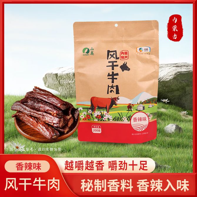 组合销售 产品介绍 产品规格 售后服务 产品咨询 发现好货 蒙都 风干牛肉干 500g (原味/五香/孜然/香辣)下单备注口味 新老包装随机 7000 里程 蒙都 酱牛肉200g*2袋 卤牛肉 熟食 内蒙古特产 五香真空包装熟牛肉 4100 里程 百草味 白芝麻猪肉脯100g 休闲零食肉干肉脯 1100 里程 百草味 原切牛肉片50g*1袋 牛肉干休闲零食 特产小吃肉干 1500 里程 三只松鼠(Three Squirrels) 蜀香牛肉麻辣味肉脯即食卤味牛肉 100gx2袋 1300 里程