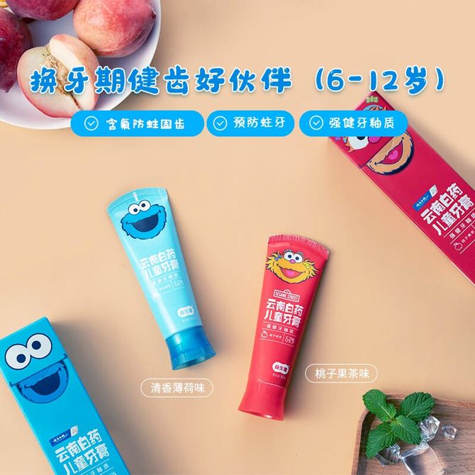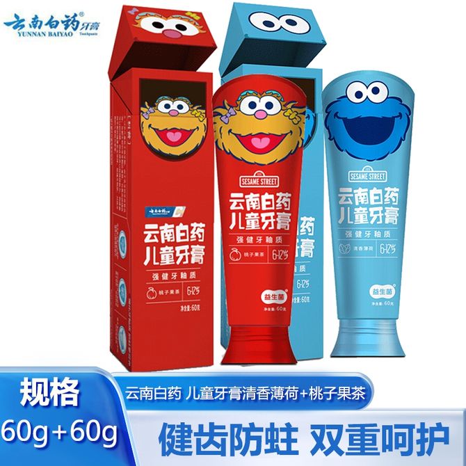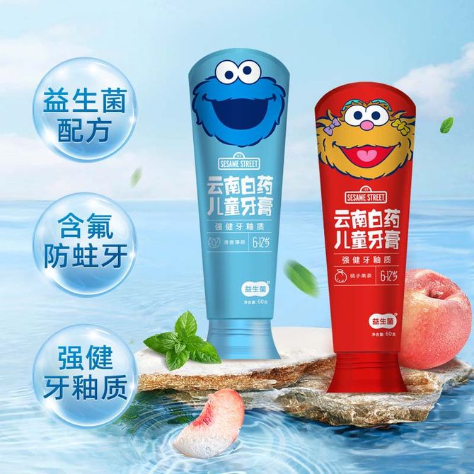 益生菌儿童牙膏芝麻街(6-12岁)清香薄荷 60g+桃子果茶60g 详情共用