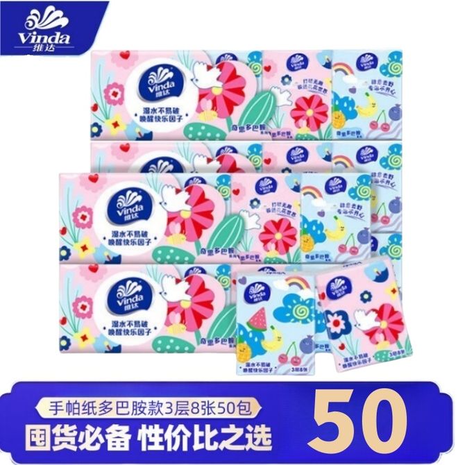 维达 手帕纸多巴胺3层8张餐巾纸面巾纸擦手纸卫生纸巾 3层 8张*50包 3层 8张*50包,新老包装交替 兑换价格 1100 里程 会员卡别 终身白金卡 白金卡 金卡 银卡 普通卡 儿童卡 服务 由 肃景个护生活 发货并提供售后 包装数量: 5提 购买数量: 件 库存件 配送地址: 立即购买 加入购物车 成功添加到购物车 关闭 购物车共有 种商品 总金额为: 组合销售 产品介绍 产品规格 售后服务 产品咨询 发现好货 维达卷纸 卫生纸实惠装厕纸家用厕所纸巾手纸整箱批有芯大卷家庭装 1200-2300 里程 维达 Vinda 卷纸 140g/卷*10卷 蓝色经典3层卫生纸 1300 里程 心相印抽纸 茶语丝享系列 量贩家庭装 3层*100抽*4包(茶香 压花) 1100 里程 心相印 经典系列 二层面巾纸 180抽*6包*1提 1100 里程 维达Vinda 超韧系列抽纸(3层*130抽*6包) 原生木浆卫生餐巾纸婴儿面巾纸 6包优惠装 1100 里程