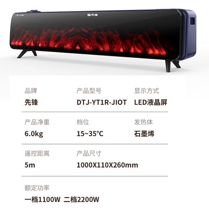先锋 踢脚线取暖器 DTJ-YT1R-JIOT 智能休眠 24小时定时防水机身浴室也能取暖 兑换价格 43500 里程 会员卡别 终身白金卡 白金卡 金卡 银卡 普通卡 儿童卡 服务 由 弘济家电 发货并提供售后 颜色: 其他 购买数量: 件 库存件 配送地址: 立即购买 加入购物车 成功添加到购物车 关闭 购物车共有 种商品 总金额为: 组合销售 产品介绍 产品规格 售后服务 产品咨询 发现好货 彩虹 全线路安全保护调温电热毯 单人款 1.5*0.7米 XL1203 4500 里程 康佳/Konka 取暖器家用石墨烯暖风机立式电暖气浴室电暖风节能热风机速热暖风扇摇头电暖器烤火炉 5700 里程 彩虹(RAINBOW)电热毯全线路安全保护双控双温电热毯(1.8*1.5m)定时电褥子电暖毯一键排潮高温自动断电1358花色随机 8700 里程 美的(Midea)热水器 F05-15A1(S) 厨宝快热小厨宝5升厨房热水宝储水迷你安全家用蓝钻内胆安全厨宝洗速热上出水非下出水 5升上出水1650W速热 17800 里程 志高/Chigo 取暖器 家用节能省电立式暖风机 电暖气速热神器 ZNB-XE01J 8600 里程