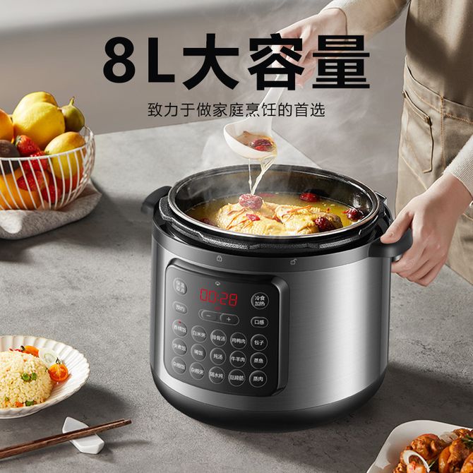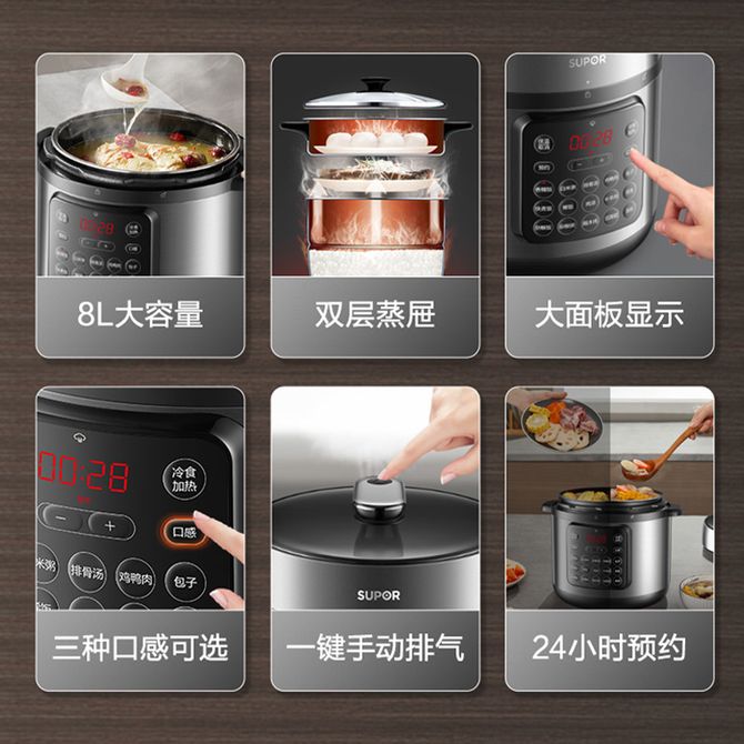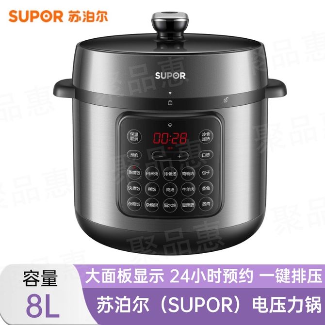 苏泊尔(SUPOR) 大容量电压力锅大号电高压锅家用8升蒸煮多用锅双层蒸屉大面板24小时预约 口感多选 24H预约 15大功能选择 大面板操控 8L大容量 兑换价格 26100 里程 会员卡别 终身白金卡 白金卡 金卡 银卡 普通卡 儿童卡 服务 由 聚品惠家电生活馆 发货并提供售后 颜色: 其他 购买数量: 件 库存件 配送地址: 立即购买 加入购物车 成功添加到购物车 关闭 购物车共有 种商品 总金额为: 组合销售 产品介绍 产品规格 售后服务 产品咨询 发现好货 苏泊尔(SUPOR)电压力锅 6升大容量 智能触控 球釜双胆 开盖收汁 一键排压 SY-60YC8001Q 高压锅 16900 里程 苏泊尔(SUPOR) 5L电压力锅家用电高压锅双胆高压电饭锅煮饭智能预约 SY-50YC8186 11300 里程 美的/Midea 电压力锅 【一锅双胆】5L全自动家用智能预约 上蒸下煮 不粘双胆煲汤炖肉 YL50Q3-451 10900 里程 美的/Midea 电压力锅 【双胆】5升大容量电饭煲全自动智能饭锅多功能高压锅 24小时智能预约 MY-E523 10400 里程 九阳/Joyoung 电压力锅5L家用电饭锅压力煲电高压锅煮饭锅电饭锅电饭煲全自动智能预约 Y-50C31 11000 里程